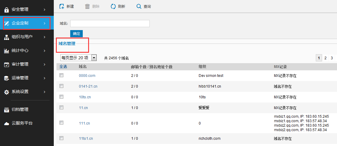 管理员可登录系统管理界面-企业定制-域名管理,在域名列表中单击域名进入的域名修改页面: