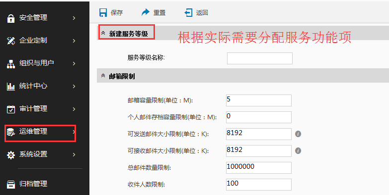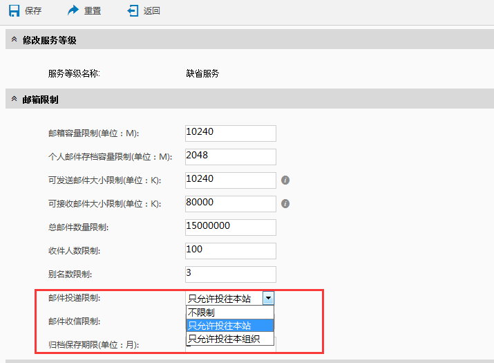 管理员可在系统管理界面-运维管理-用户服务等级-单击进入用户服务等级修改页面,在“邮箱限制”栏中,对“邮件投递限制”和“邮件收信限制”分别选定只能对本站进行收发,修改后保存。则绑定该服务等级的用户邮件只能在本站内进行收发。