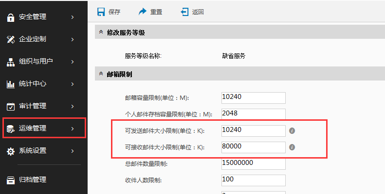 Coremail系统中使用服务等级来对用户进行限制,如邮箱容量、收发的邮件大小等。如果管理员想设置,可在系统管理界面-运维管理-用户服务等级-需修改的服务等级中设置。其中如果要限制用户邮箱接收附件的大小,可在这一项修改:可接收邮件大小限制(单位:K):