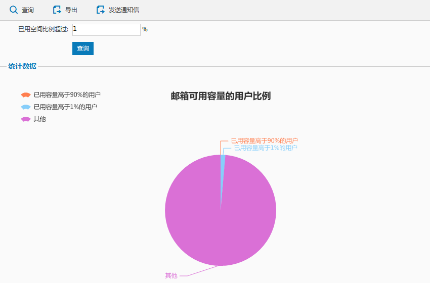 您可通过系统管理界面-运维管理-运行情况-邮箱空间使用情况,填写查询的空间比例进行了解。系统将会显示超过该空间比例的用户。