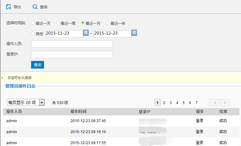 1. 单击进入管理操作日志页面,设定您需要查询的时间,您可查看的哪些操作人员,在某一时刻的操作项目和操作的结果说明。