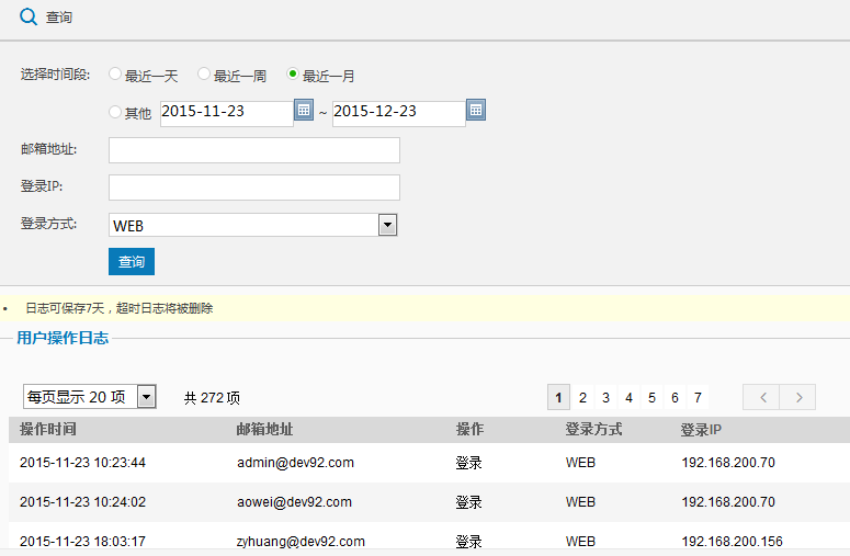 2. 单击进入用户操作日志页面,设定您需要查询的时间,您可查看哪些用户邮箱地址,在某一时刻的操作项目,登录方式和操作的结果说明。