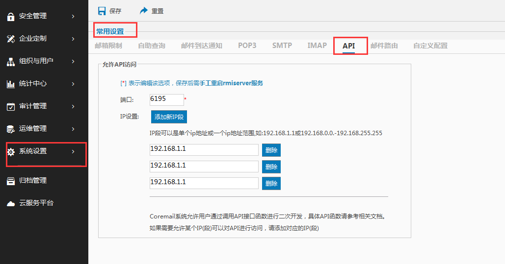 您在进行API访问之前,请预选添加允许访问的IP,在系统管理界面-系统设置-常用设置-API中添加新IP段: